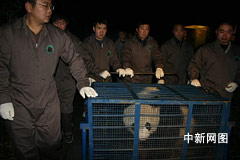 工作人員運(yùn)送“團(tuán)團(tuán)”“圓圓”