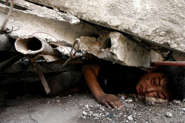 2008年5月15日,在四川省北川縣城的廢墟下,26歲的男子陳堅(jiān)在等待援救。晚上8時(shí),經(jīng)過7個(gè)鐘頭的營(yíng)救他被救出,但由于傷勢(shì)嚴(yán)重沒能活下來(lái)。作者:郭鐵流 中國(guó)