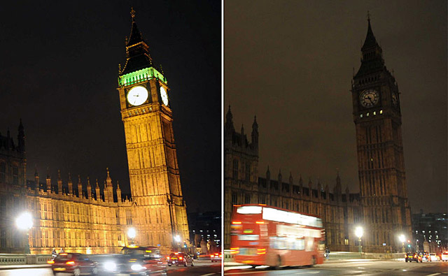 英國倫敦:3月28日,位于倫敦的英國議會(huì)大樓熄燈時(shí)(下)和重新亮燈后的對(duì)比情況。