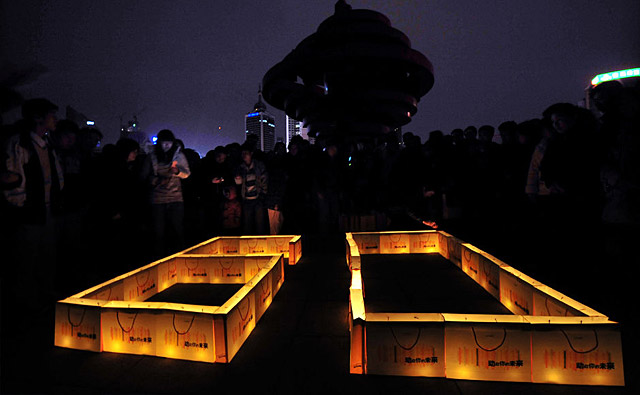 中國青島:3月28日,市民在青島五四廣場上擺出一小時“60”分鐘的造型參加“地球一小時”活動。