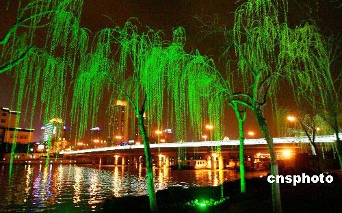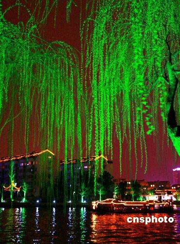 3月17日晚,蘇州環(huán)城河邊楊柳與建筑物在景觀燈的映照下格外迷人。陽春三月,當(dāng)夜幕降臨后的蘇州環(huán)城湖畔,排列成行的絲絲垂柳在景觀照明燈下,霓裳艷影,水上游船、古橋和兩岸建筑物相映成輝,璀璨奪目,景色迷人。中新社發(fā) 蘇秀 攝