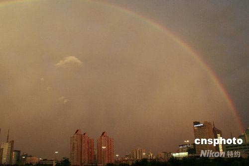 7月2日傍晚,杭州城降下雷雨。緊大雨結(jié)束后,天空出現(xiàn)彩虹,杭州城上空出現(xiàn)難得一見的美麗景色。中新社發(fā) 王曉苑 攝