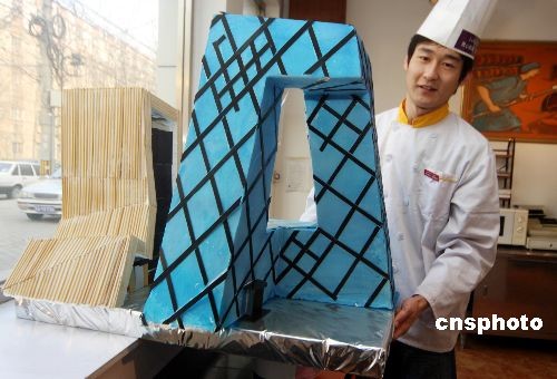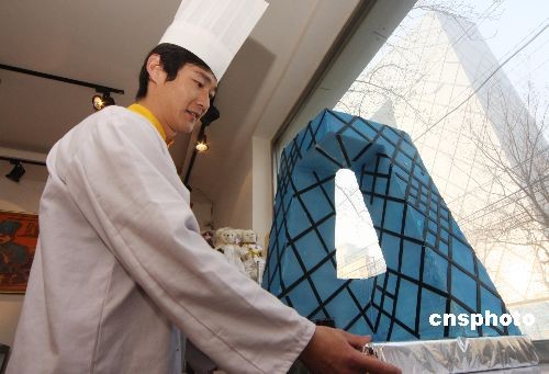 12月12日,在北京某蛋糕店,一位師傅正將自己制作的“央視蛋糕樓”擺上窗臺(tái)。近日,一個(gè)高約70厘米,模仿中央電視臺(tái)新臺(tái)址外形制作的蛋糕亮相北京某蛋糕店,吸引了路人的目光。中新社發(fā) 吳芒子 攝
