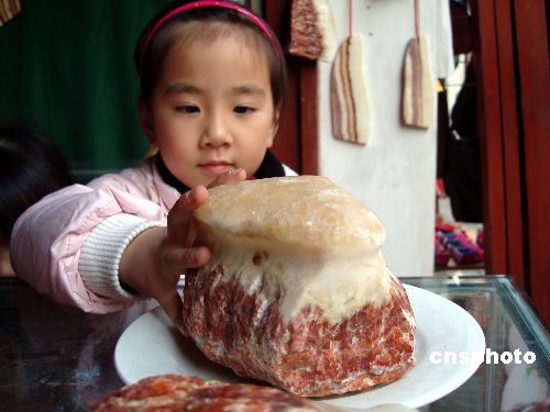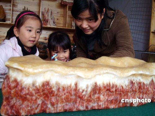 12月13日,在江蘇蘇州古鎮(zhèn)同里一家奇石店內(nèi)一種酷似豬肉的天然石頭吸引了眾多游客。據(jù)悉,這些“豬肉石”是在地質(zhì)運(yùn)動(dòng)過(guò)程中與其他礦物質(zhì)接觸色化而成,不但長(zhǎng)有“肉皮”,而且“瘦肉”和“肥肉”之分,呈現(xiàn)出多層次,十分逼真。中新社發(fā) 王建康 攝