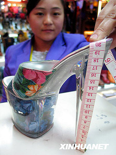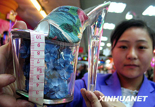 12月15日,在濟南一商場,工作人員展示“超級高跟鞋”。這款“超級高跟鞋”造型獨特,款式夸張,鞋底厚10厘米,鞋跟高20厘米,吸引了許多顧客的眼球。新華社發(fā)(趙曉明 攝)