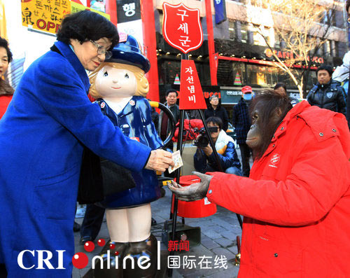 2008年12月15日,一只來(lái)自韓國(guó)高陽(yáng)一家動(dòng)物園的猩猩當(dāng)日現(xiàn)身首爾明洞街頭,為慈善組織“救世軍”募捐!熬仁儡姟北驹鲁蹰_(kāi)始在韓國(guó)各大城市街頭接受社會(huì)捐贈(zèng)。
