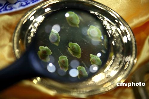 世界上最小的餃子有多大?12月20日上午,在濟南舉辦的第二屆齊魯民間膳食文化藝術節(jié)開幕式上,直徑僅有8毫米的齊魯珍珠餃亮相。餃子的餡由珍珠泉內(nèi)養(yǎng)殖的花蓮魚肉調(diào)成,每個上面還有文字,須通過放大鏡才能看清。中新社發(fā) 王輝 攝