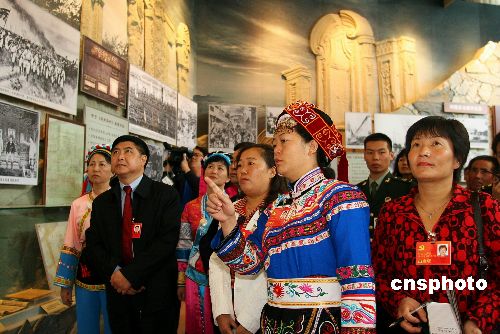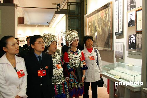 10月19日,參加中共十七大會(huì)議的湖南省代表身著傳統(tǒng)苗族服飾,在軍事博物館參觀《復(fù)興之路》展覽。中新社發(fā) 富田 攝