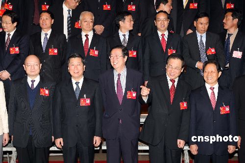 十月十九日,出席中共十七大的中央金融系統(tǒng)代表在駐地合影留念。前排從左至右為國家開發(fā)銀行行長陳元、證監(jiān)會主席尚福林、中國人民銀行行長周小川、銀監(jiān)會主席劉明康、保監(jiān)會主席吳定富。中新社發(fā) 毛建軍 攝