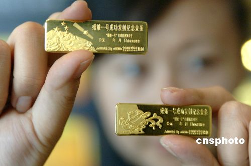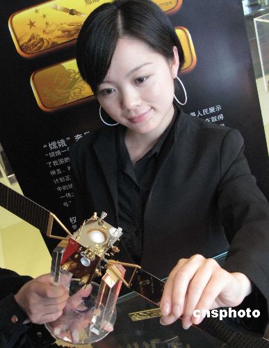 “嫦娥一號(hào)”成功發(fā)射揭開了中國(guó)探月工程的序幕。為紀(jì)念這一成就,10月25日,“中國(guó)國(guó)家博物館藝術(shù)品開發(fā)中心監(jiān)制的“嫦娥一號(hào)”紀(jì)念金條在北京由國(guó)道黃金公司宣告發(fā)行!版隙鹨惶(hào)”紀(jì)念金條一套兩根,各為25克AU9999黃金,計(jì)限量發(fā)行2007套。第一根金條精雕象征中國(guó)萬(wàn)里長(zhǎng)城、五星紅旗和“嫦娥一號(hào)”在太空飛行的姿態(tài);第二根金條雕刻有嫦娥奔月的傳統(tǒng)神話圖案,寓意國(guó)人千年的夢(mèng)想開始變成現(xiàn)實(shí)。金條背面雕刻的是“嫦娥”一號(hào)在太空的運(yùn)行圖。該紀(jì)念金條經(jīng)專業(yè)黃金工藝大師構(gòu)思設(shè)計(jì)完成。圖為公關(guān)員持金條在鍍金的“嫦娥一號(hào)”配送禮品前亮相。中新社發(fā) 鄒憲 攝