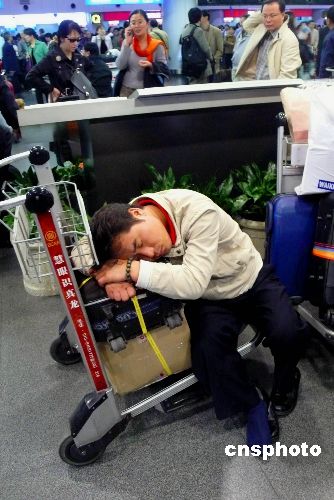 十月二十六日,一位旅客在北京首都國際機場候機大廳睡著了。當(dāng)天,北京遭遇大霧天氣,北京氣象臺已發(fā)布大霧橙色預(yù)警信號。因能見度太低,交通受阻,航班延誤,大批旅客滯留機場。中新社發(fā) 王瑤 攝