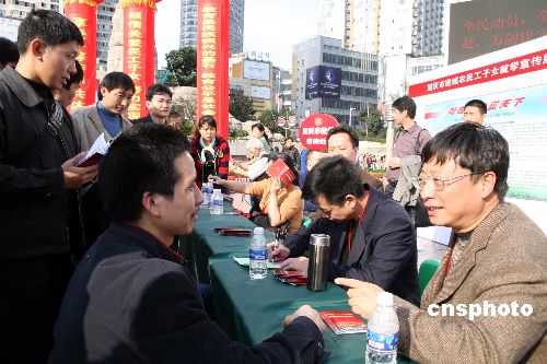 11月2日,重慶市教委為該市農(nóng)民工子女就學(xué)舉行大型咨詢活動(dòng),眾多當(dāng)?shù)剡M(jìn)城務(wù)工人員前來(lái)咨詢學(xué)校招生、轉(zhuǎn)學(xué)等問(wèn)題。據(jù)悉,此次咨詢活動(dòng)是該市政府為迎接首個(gè)“重慶農(nóng)民工日”舉行的系列活動(dòng)之一。中新社發(fā) 郭晉嘉 攝