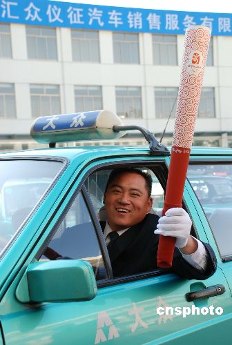 11月1日,中國大陸第一位出租車司機(jī)“奧運(yùn)火炬手”在山東淄博產(chǎn)生。他是山東淄博大眾交運(yùn)公司雷鋒出租車司機(jī)于國平。2008年于國平將參加2008北京奧運(yùn)火炬山東段的傳遞活動。中新社發(fā) 梁寶海 攝