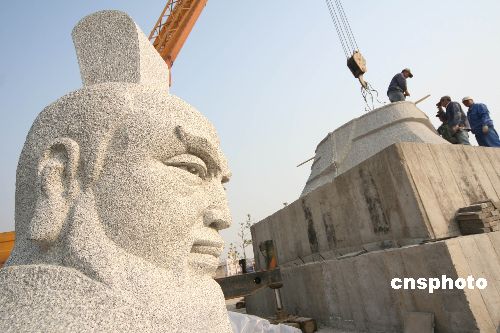 11月6日,由北京運(yùn)抵許昌魏武帝廣場(chǎng)的曹操雕像開始組裝安放。這座曹操像高度6.95米,像身重量近200噸,底部積座的長(zhǎng)度和寬度均為5米,通身采用耐風(fēng)化、不變色的花崗巖雕刻而成,半月左右可全部安裝完畢。據(jù)了解,該座雕像由中央美院雕塑系教授段海康等專家經(jīng)數(shù)次設(shè)計(jì),歷經(jīng)多個(gè)環(huán)節(jié)最終完成。中新社發(fā) 牛書培 攝