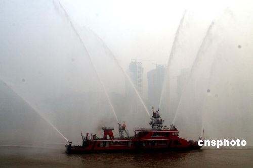 11月8日,重慶市水警總隊和重慶市水上消防支隊聯(lián)合舉辦“生命至上、平安和諧”大型消防安全宣傳活動,旨在進(jìn)一步喚起當(dāng)?shù)孛癖妳⑴c消防工作的熱情,增強(qiáng)民眾對消防工作的參與度。圖為重慶水上消防戰(zhàn)斗艇進(jìn)行射水表演。中新社發(fā) 郭晉嘉 攝