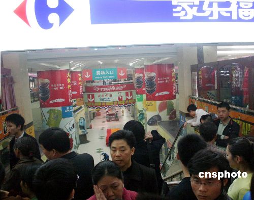 11月10日上午8時20分左右,重慶沙坪壩區(qū)家樂福商場內(nèi),發(fā)生一起因爭搶特價食用油造成的踩踏傷亡事故。目前已致3人死亡31人受傷,其中7人傷勢嚴(yán)重。圖為事故發(fā)生后,該超市隨即暫停營業(yè),超市門口聚集大批當(dāng)?shù)厥忻。中新社發(fā) 郭晉嘉 攝