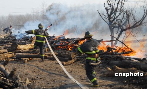 2007年11月10日,位于山西省盂縣一家廢舊木材回收站突然發(fā)生火災(zāi),盂縣消防大隊接警后迅速趕赴現(xiàn)場撲救,經(jīng)過近1個多小時的緊急撲救,終于將大火撲滅;馂(zāi)未造成人員傷亡,并成功防止了火勢向周圍民房和森林的蔓延。目前,火災(zāi)原因和損失正在調(diào)查之中。中新社發(fā) 程瑜 攝