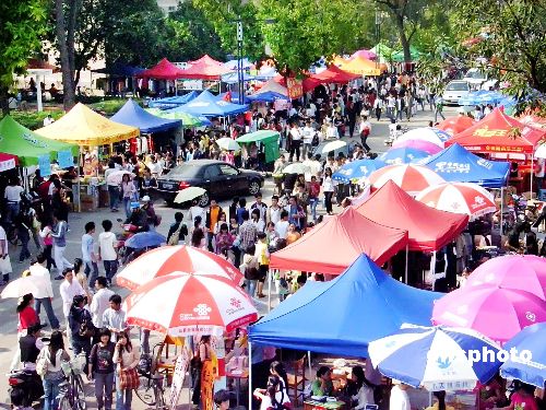 2007年11月9-10日,廣西大學一年一度的校園運動會舉行。每年的運動會期間,學生們都主動到社會拉商家贊助,只要商家贊助,學校就允許商家在運動會現(xiàn)場周邊擺攤經(jīng)營。今年商家的進入達到高峰,校園主干道密密麻麻地擺滿了小攤,人頭涌動,車水馬龍,整個校園就像一個露天大超市。中新社發(fā) 駱文剛 攝