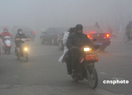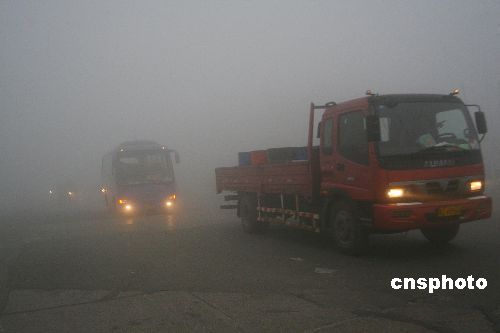 2007年11月23日,大霧籠罩下的105國道濟南平陰段,行人車輛緩緩行駛。一場大霧當日凌晨襲擊山東濟南,能見度明顯降低,濟南市氣象臺6時40分發(fā)布大霧橙色預警信號:預計未來6小時內大部地區(qū)可能出現(xiàn)能見度小于200米的霧。受大霧影響,截止8時,京福高速山東段、濟青高速、濟聊高速、濟南繞城高速等全部封閉、濟南機場所有航班均延遲。中新社發(fā) 俄國慶 攝