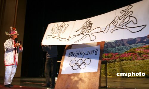 11月29日,遼寧沈陽鄭錫平在八一劇場北方老齡藝術(shù)團5周年年慶會上,用自制的自來水毛筆表演“倒著一筆”分別寫完“2008北京奧運”、“五環(huán)”、“迎奧運”等,得到與會人員的贊嘆。