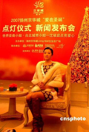 11月30日,揚州舉辦“愛在圣誕”點燈儀式及中國麥田計劃獻愛心新聞發(fā)布會。世界亞裔小姐、臺北城市小姐沈璀庭出席,并將于12月1日晚在揚州京華城廣場為21米高的巨型圣誕樹啟動“愛在圣誕”點燈儀式,并與“中國麥田計劃”愛心慈善團體攜手獻愛心!爸袊溙镉媱潯庇2005年成立,是一個為貧困地區(qū)兒童建立圖書室、捐贈衣物及創(chuàng)造讀書機會的民間志愿組織。中新社發(fā) 崔佳明 攝