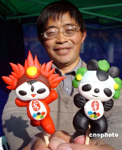 2007年12月5日,蘇州面塑藝人呂樹華用一雙巧手捏出的奧運福娃造型面塑作品,形象逼真、可愛,表達了他對2008年奧運會的美好祝愿。中新社發(fā) 王建康 攝