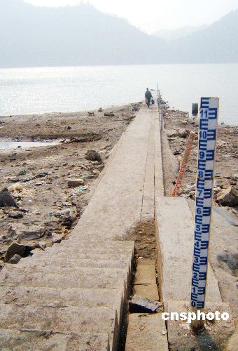 2007年12月7日,湖北宜昌江段裸露的江灘和水位標(biāo)尺。目前長江已進(jìn)入一年一度的枯水期,近期長江中游水位持續(xù)退落,比多年同期平均水位低近1.5米,根據(jù)當(dāng)前枯水形勢及水位水情特征,長江航務(wù)管理局決定,長江中游實施二級橙色預(yù)警。對通過中游的船舶吃水深度進(jìn)行規(guī)定,普通貨船實際吃水控制在2.4米及以下,危險品船舶實際吃水控制在2.3米及以下,下行船舶超過吃水限制的一律在宜昌港減載。中新社發(fā) 任衛(wèi)紅 攝