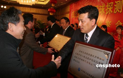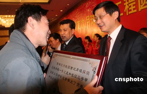 中國(guó)航天科技集團(tuán)公司兩位新任副總經(jīng)理袁家軍(中)、吳燕生(右)等向?yàn)樵摷瘓F(tuán)承擔(dān)首次月球探測(cè)工程研制任務(wù)提供幫助和支持的協(xié)作、配套單位授牌。