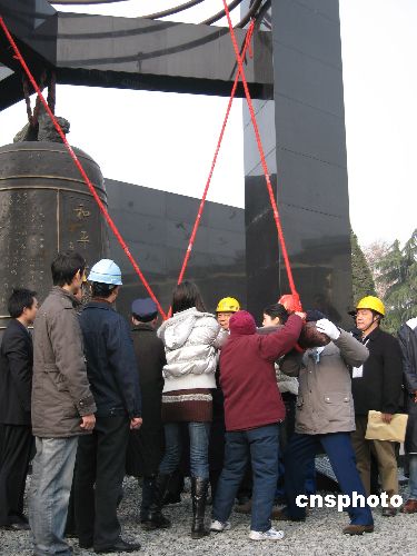十二月十三日十時,江蘇省各界人士八千多人在新落成的侵華日軍南京大屠殺遇難同胞紀念館新館前的和平廣場隆重舉行“悼念侵華日軍南京大屠殺三十萬同胞遇難七十周年暨侵華日軍南京大屠殺遇難同胞紀念館擴建工程竣工儀式”。南京大屠殺幸存者代表、青少年代表、擴建工程建設(shè)者代表放飛和平鴿,并撞響了“和平大鐘”。中新社發(fā) 朱曉穎 攝