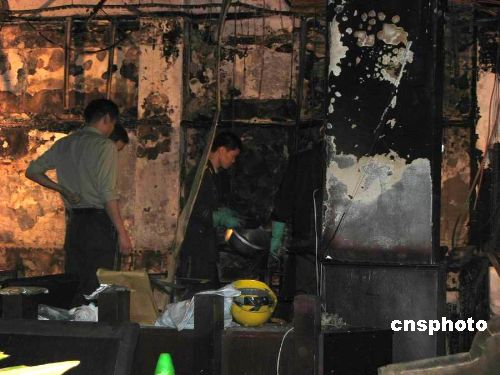 廣東東莞市樟木頭鎮(zhèn)怡安街名典西餐廳十二月十二日晚發(fā)生火災,現(xiàn)場死傷十九人,其中死亡十人,重傷一人,輕傷八人,至深夜重傷者也不治身亡。樟木頭素有小香港之稱,境外人士眾多,火災發(fā)生后坊間曾傳聞死者中有外國人,十三日從樟木頭鎮(zhèn)政府得到證實,火災死傷者皆為中國內地人士,并無境外人士。圖為火災撲滅后的名典西餐廳內一片狼藉,消防隊員在現(xiàn)場進行勘查。中新社發(fā) 李映民 攝