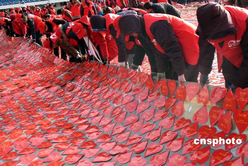 十二月二十九日,一個(gè)名為“共享健康·愛心接力”大型公益活動(dòng)在北京奧體中心體育場和廣州奧體中心體育場同時(shí)展開。一千位來自中國各地的老人作為“愛心大使”,把載滿愛心故事的十萬顆小紅“心”貼成兩顆巨大的“愛心”,以沖擊吉尼斯世界紀(jì)錄。中新社發(fā) 黎仲顏 攝