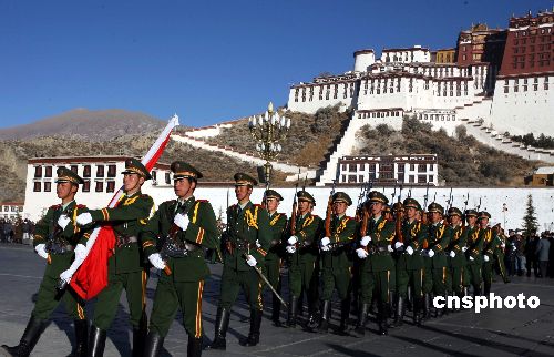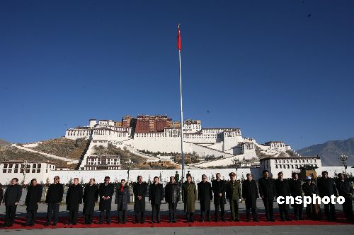 二00八年一月一日,西藏自治區(qū)在拉薩布達(dá)拉宮廣場(chǎng)舉行升國(guó)旗、唱國(guó)歌活動(dòng),來(lái)自各界的三千多人參加了升旗儀式。中新社發(fā) 賈長(zhǎng)飛 攝