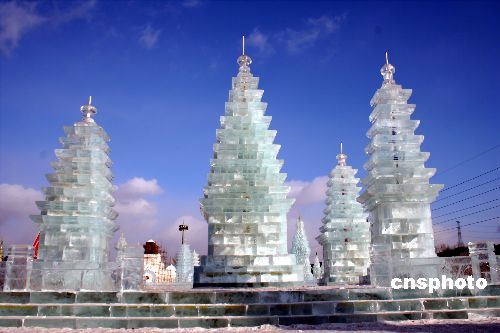 2007年12月31日,沈陽(yáng)棋盤山冰雪大世界云南大理三塔等大型冰雕及雪雕已現(xiàn)雛形。1月8日,2008沈陽(yáng)國(guó)際冰雪節(jié)將開幕。中新社發(fā) 劉寶成 攝