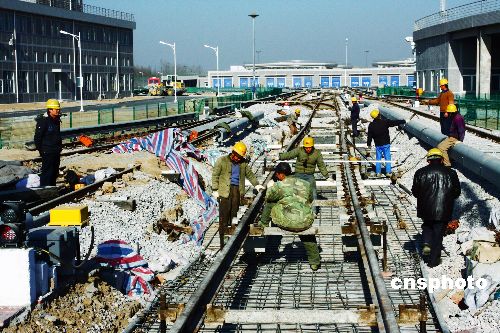 北京地鐵10號線萬柳車輛段,工作人員在加緊軌道工程建設(shè),并對首批車輛進(jìn)行檢測調(diào)試工作。