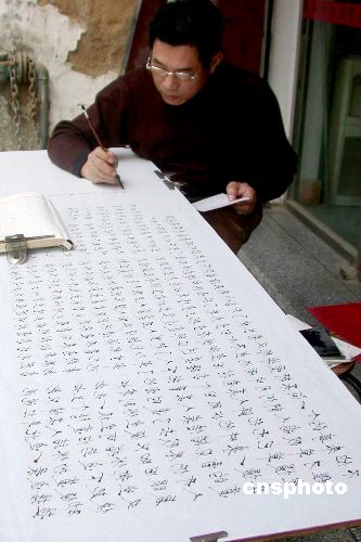 2008年初,被譽(yù)為“倒影王”的廣東惠州市博羅縣居民唐天華用了歷時(shí)三年的時(shí)間,完成了倒影字書法作品《紅樓夢》,共計(jì)75萬字,使用宣紙1018張,對齊擺放起來共1832.4米起長。中新社發(fā) 宋秀杰 攝
