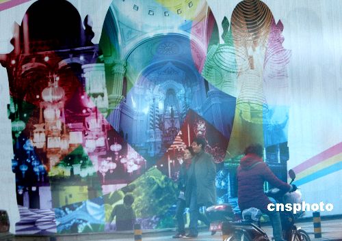 2008年新年伊始,北京市中心街頭矗立起巨大的“感受澳門”宣傳圖,讓民眾在隆冬時(shí)節(jié)了解澳門文化遺產(chǎn)、感受“南國(guó)”春光明媚、五彩繽紛的景象。中新社發(fā) 趙振清 攝