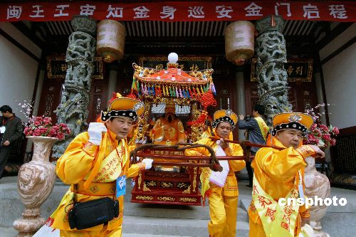 一月八日,福州市晉安閩臺王審知研究會在福州蓮花山閩王紀(jì)念館舉行儀式,歡送閩王金身首次巡安金門。九日上午,閩王金身將經(jīng)廈金航線直航金門,進(jìn)行為期四天的巡安活動。中新社發(fā) 王東明 攝