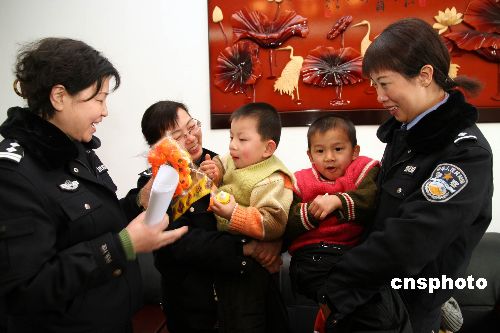 1月10日,沈陽市公安局社區(qū)警務(wù)支隊民警到市兒童福利院為無戶口的31名棄嬰解決戶口問題,并送去落戶手續(xù)。社區(qū)警務(wù)支隊的民警還為孩子們送去了精心選購的各種禮物。這些被遺棄的孤兒,多數(shù)無法查找到他們的身源,沒有戶口就如沒有一個合法的公民身份。為了不影響這些孩子今后的成長、生活、學(xué)習(xí)、就業(yè)。沈陽市公安局社區(qū)警務(wù)支隊采取特事特辦的方式,解決棄嬰們的后顧之憂。到目前為止已為263名棄嬰辦理了落戶。中新社發(fā) 黃金昆 攝