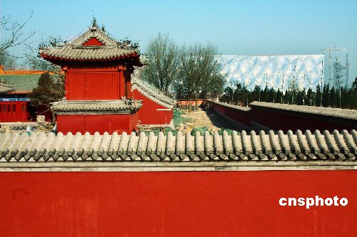 1月11日,為保持明代建筑風(fēng)貌,曾迫使北京的國家游泳中心“水立方”施工位置北移的北頂娘娘廟,近日完成階段性施工。位于“水立方”南側(cè)的北頂娘娘廟為明代廟宇,是北京歷史上著名的“五頂八廟”之一、北京城中軸北延長線上的一個(gè)標(biāo)志性建筑。修繕一新的北頂娘娘廟紅墻、琉璃瓦的古典味,與“水立方”的現(xiàn)代化遙遙相對形成強(qiáng)烈對比。中新社發(fā) 鄭雄增 攝
