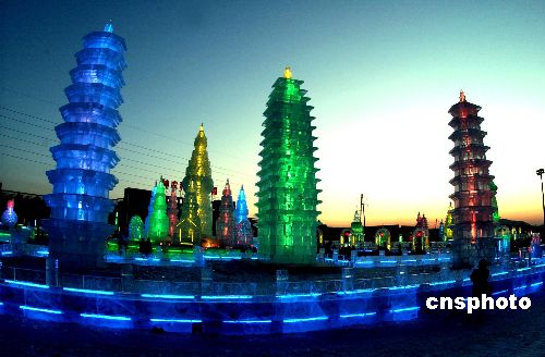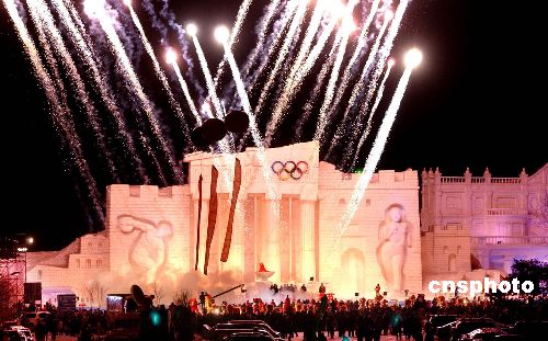 1月11日晚,2008中國沈陽國際冰雪節(jié)開幕。本屆冰雪節(jié)的雪雕和冰雕超越歷屆冰雪節(jié),創(chuàng)下數(shù)量、高度和規(guī)模之最。開幕式上《從雅典到北京》、《龍騰奧運(yùn)》等六座大型雪雕與杭州古塔、沈陽舍塔等建筑冰雕等點(diǎn)亮了主會場棋盤山之夜。 中新社發(fā) 羅瀾 攝