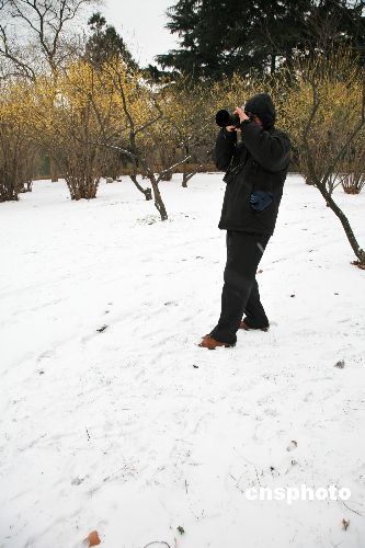 1月13日,一位攝影愛(ài)好者在公園拍攝雪景。