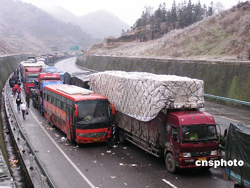 圖為高速公路上車輛排成長龍。從1月14日受冷空氣影響,貴州福泉市溫度一直下降在-1℃—2℃,夜間下雨雪,造成公路面上結(jié)冰凍。福泉市公安交警大隊為確保過往客運、貨運車輛安全,1月18日下午16時對貴新高速公路馬場坪站、馬(馬場坪)至遵(遵義)公路進行封鎖,全隊民警24小時值班守護。中新社發(fā) 易勝武 攝