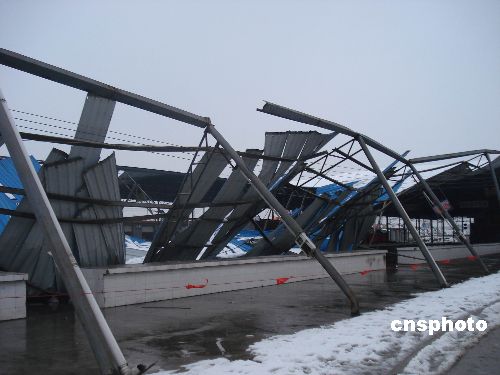 2008年1月20日凌晨,由于連日的暴雪,導(dǎo)致安徽省合肥市包河苑農(nóng)貿(mào)市場(chǎng)上千平方米蔬菜大棚被雪壓塌。由于連降暴雪,安徽合肥等地,不少工廠倉庫和農(nóng)貿(mào)市場(chǎng)的簡易大棚被雪壓塌,目前沒有造成人員傷亡。中新社發(fā) 何保豐 攝