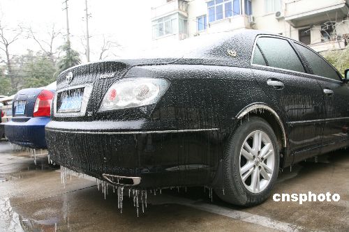 一月二十六日,江西四十二個縣市出現(xiàn)凍雨,是該省近二十年來遭遇的最嚴重凍雨(雨滴與地面或地物等接觸即凍結的雨)天氣。由于持續(xù)嚴寒,整個江西省儼然一個諾大的“滑冰場”,滿街跑的盡是“凍車族”。中新社發(fā) 吳慶才 攝