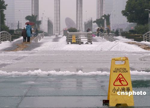 1月28日,上海城鄉(xiāng)大雪紛飛,上海氣象臺再次發(fā)布道路結冰警報。圖為提醒路人防滑的警示牌在上海的公共場所隨處可見。中新社發(fā) 個路 攝