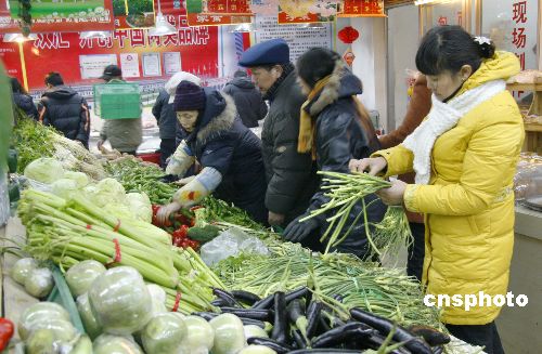 圖為池州市民在排隊(duì)購(gòu)買新調(diào)運(yùn)來的蔬菜。1月30日,安徽池州東方購(gòu)物中心冒雪從海南、合肥等地緊急調(diào)運(yùn)3萬公斤蔬菜投放池城市場(chǎng),保障池州市場(chǎng)蔬菜供應(yīng)、穩(wěn)定蔬菜價(jià)格起到積極作用。中新社發(fā) 程 昭 攝