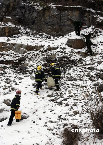 1月31日,重慶消防官兵為被困在大山中的民工送水。1月11日以來(lái),重慶遭遇罕見(jiàn)持續(xù)低溫天氣,連日雨雪交加,造成27個(gè)區(qū)縣、520余萬(wàn)人受災(zāi),17天內(nèi)發(fā)布了77起災(zāi)害性天氣預(yù)警信號(hào)。中新社發(fā) 萬(wàn)明 攝