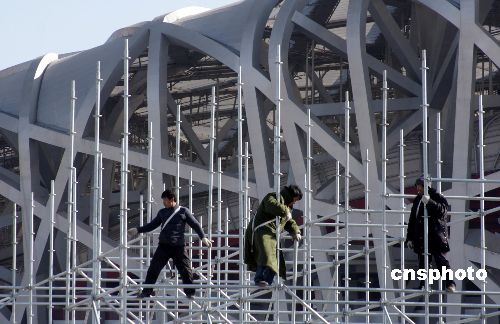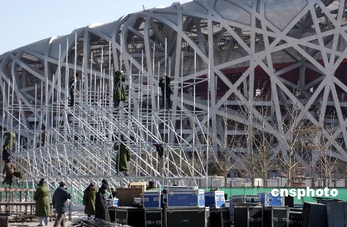 2月1日,工人在北京“鳥巢”奧運工地搭設晚會舞臺,迎接大年三十晚會到來。據(jù)了解,今年春節(jié)“鳥巢”工地將有五六百名工人堅守在各自崗位上,這場晚會專門為他們準備的。中新社發(fā) 吳芒子 攝