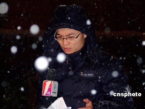 2月1日晚11點,浙江電視臺記者冒著大雪在杭州火車站現(xiàn)場采訪。連日來,杭州持續(xù)低溫、強降雪,導致旅客大量滯留。中新社發(fā) 邱柏星 攝