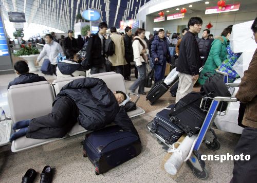 2月2日,上海再遇暴雪,浦東國(guó)際機(jī)場(chǎng)春運(yùn)工作受到嚴(yán)重影響。僅2月1日,上海虹橋、浦東兩機(jī)場(chǎng)共延誤二百多個(gè)航班,取消十多個(gè)航班。圖為一位旅客在候機(jī)大廳酣睡。中新社發(fā) 潘索菲 攝